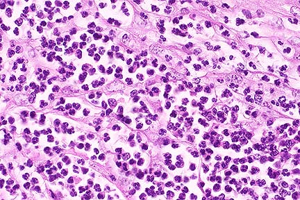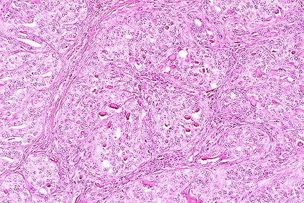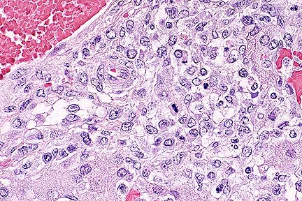 Conference Note: Renal cell carcinoma is the most common renal tumor of dogs, cattle, and sheep. It is most common in mature and aged animals. Polycythemia associated with erythropoietin production by the neoplasm occurs rarely and resolves when the mass is excised. Histologically, neoplastic cells are cuboidal to polygonal with distinct cell borders. The cytoplasm of neoplastic cells varies from eosinophilic or basophilic and granular to vacuolated and clear. Renal clear cells are present in variable numbers in most renal carcinomas, even when they are not the predominant cell type. Neoplastic cells can be arranged in sheets, papillary projections or tubular structures; all of these patterns may be present within a single tumor. Renal cell carcinomas grow expansivily and there is often local invasion. In the dog, metastasis is common and widespread, usually to the lung and liver. Metastasis is reported less frequently in cattle.