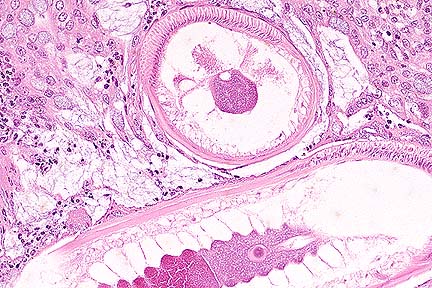Conference Note: Trichuris sp., or whipworms, inhabit the cecum and occasionally the colon of all domestic animals except the horse. The life cycle is direct and eggs can persist in the environment for several years. Ingestion of larvated eggs leads to release of third-stage larvae which enter the mucosa of the small intestine for 7-10 days before they reenter the gut lumen and move to the cecum. There is a prepatent period that lasts from 6-12 weeks depending upon the species. Infection is usually light and there is little alteration of the mucosa. Mucohemorrhagic typhlocolitis may develop in heavy infections and is characterized by mucus hypersecretion from hypertrophied colonic glands, focal hemorrhage, erosions, and a mixed inflammatory infiltrate within the lamina propria. The following are characteristic histologic features of trichurids: a stichosome, a bacillary band at the anterior end, and hypodermal bands within the musculature rather than the lateral hypodermal chords seen in other families of nematodes.