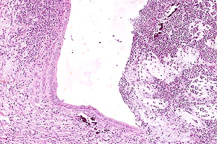 Microscopically, this rumen has epithelial hyperplasia and hyperkeratosis. The epithelium is edematous with vesicle formation, and a purulent inflammation is present with the formation of pustules. Large numbers of bacilli are on the lumenal surface along with a few yeast organisms consistent with Candida sp.