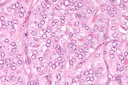 The 1 cm renal mass is well circumscribed and partially encapsulated. The mass elevates the renal capsule and extends almost to the corticomedullary junction. The tumor is subdivided into lobules by a dense fibrovascular stroma. Foci of lymphocytes and plasma cells, hemorrhage and hemosiderin are scattered in adjacent renal interstitial tissue. The tumor is composed of cuboidal to columnar cells forming papillary, cystic, and tubular areas as well as scattered solid areas. Cells tend to be polygonal in solid areas. Tumor cells have oval to round nuclei with stippled chromatin. Nuclei are often located at the basilar end of the cell, especially when forming tubules or papillary structures. Mitotic figures are rare. The cells have eosinophilic finely granular cytoplasm with distinct cellular margins. Cystic spaces and tubules contain proteinaceous product and laminated calcified spherical concretions (corporea amylacea).
