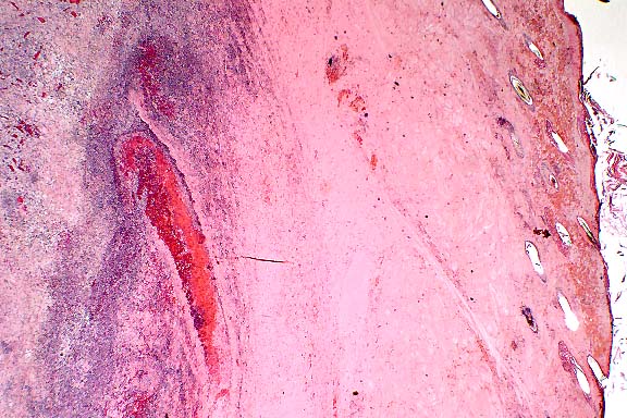 Cutaneous vasculitis in horses is usually seen as a secondary manifestation of a variety of conditions, including infectious, toxic, neoplastic, and immunologic disorders. Cutaneous arteritis has been reported in a horse with granulomatous enteritis3. Most recognized syndromes of vasculitis in horses have characteristics similar to those of hypersensitivity-vasculitis seen in humans1, in which the most common inflammatory pattern is neutrophilic infiltration of venules in the dermis and subcutis. Usually there is leukocytoclasis, or neutrophil fragmentation with nuclear debris in and around vessels, and fibrinoid necrosis of vessel walls.