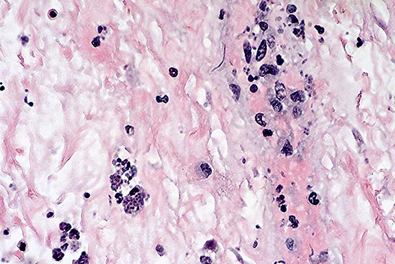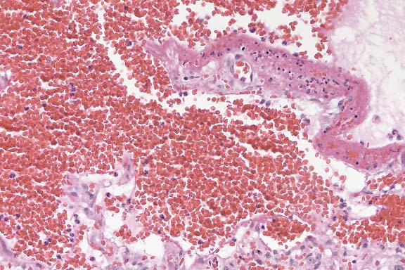 Conference Note: Gram stains performed at the AFIP demonstrated numerous gram-positive cocci within the infarcted area; some are present within the lumina of blood vessels. Because of the presence of the bacteria and the suppurative reaction, bacterial infection, particularly septicemia, is included in the differential diagnosis.