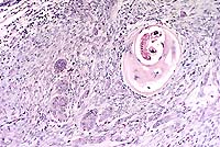 Histopathology: In the tissue sections from the oral cavity, there was invasion of the submucosa and connective tissues by a poorly encapsulated and densely cellular squamous cell carcinoma. Neoplastic cells formed small nests and cords that invaded the connective tissue, skeletal myofibers, and mandibular bone. The cells were large and polygonal with intercellular bridges and abundant well- demarcated eosinophilic cytoplasm. Nuclei were large and round with a stippled chromatin pattern and contained large, central, magenta nucleoli. There were 0-2 mitotic figures per high power field, with occasional bizarre mitotic forms. Occasional brightly eosinophilic keratin pearls were in the centers of the largest accumulations of neoplastic cells. Also within the larger foci of neoplastic cells, there were abundant cystic accumulations of necrotic debris which were occasionally admixed with small clusters of neutrophils. The mass was partly divided and surrounded by moderately desmoplastic stroma. There were numerous small blood vessels within the mass. Between the nests of cells there were numerous necrotic myofibers that were hypereosinophilic, swollen, and had lost cross-striations. At the periphery of the mass, necrotic mandibular bone was invaded by the neoplastic squamous cells. Additionally at the periphery of the mass, and occasionally surrounded by the neoplastic squamous cells, were multifocal intramysial nematode larvae identified as Trichinella sp. The larvae were 30-35 µm in diameter, coiled, and completely encapsulated within the myofibers or nurse cells. Affected myofibers were focally swollen to diameters of approximately 200 µm, which was estimated to be 2 to 8 times the diameter of the adjacent normal myofibers. The larvae were admixed with multiple myofiber nuclei and were suspended within flocculent amphophilic intracytoplasmic material in the nurse cells. The homogeneous capsules were 15-20 µm thick and were brightly eosinophilic, forming cysts around the larvae. Occasional infected myofibers were surrounded by small clusters of lymphocytes and plasma cells, with minimal numbers of eosinophils in the infiltrates. Within the neoplastic tissue, there were fewer encysted larvae than in myofibers at the tumor periphery. These larvae, in foci of necrotic debris, were occasionally degenerate, and small admixtures of neutrophils, macrophages and necrotic debris surrounded the larvae. Occasional similar intact larvae were within nurse cells within the skeletal muscle of the diaphragm. The multifocal hepatic lesions were determined to be benign cystic bile ductules.