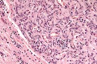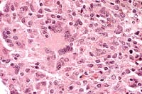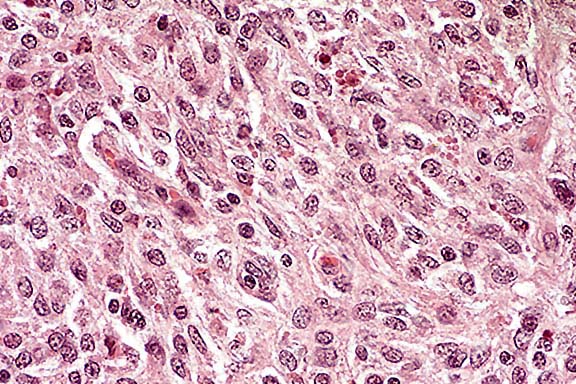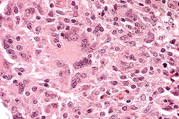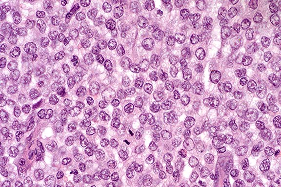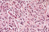 Histologically, the cells are round, ovoid or polyhedral and may be arranged in compact sheets. The cells contain moderate eosinophilic cytoplasm; nuclei have marginal chromatin and few mitotic figures. Differential diagnosis for this neoplastic mass includes lipoma, mast cell tumor, epidermoid carcinoma, squamous cell carcinoma, fibroma, and histiocytoma.
