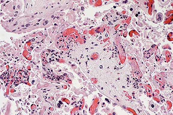 Contributor's Diagnosis and Comments: Placenta, placentitis, necrotizing, multifocal, acute to subacute, severe, with vasculitis and intratrophoblastic intracytoplasmic inclusions.