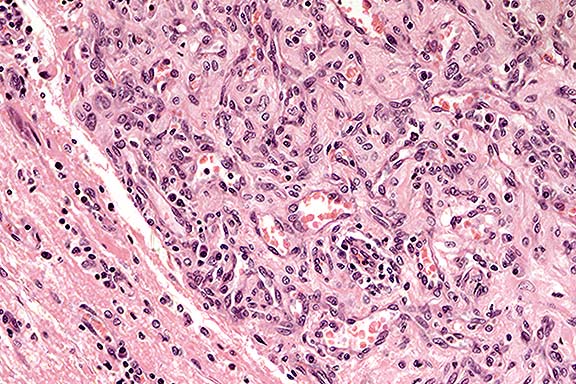 Spinal hemangioblastomas are discrete intramedullary tumors that abut the leptomeninges. Microscopically, they vary considerably in their cellular density, but generally consist of large polygonal interstitial cells, the exact nature of which is unknown, that are packed between abundant, often criss-crossing capillary channels. There are at least 3 variants of this tumor described.5