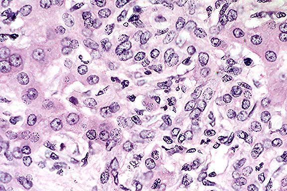 Histologically, the lesions consist of severe, multifocal to coalescing ulceration of the colonic mucosa and abscess formation within muscular layers of the colon. Intramural abscesses are composed of large mineralized necrotic centers and rims of active trophozoites of amoebic protozoa (Entamoeba histolytica). These trophozoites are located at the limit between necrotic and viable tissue. Abscesses are surrounded by granulation tissue infiltrated by neutrophils and lymphocytes. Trophozoites are fairly large (between 30 to 60 mm) and often have food vacuoles which contain red blood cells and a central spherical nucleus. A communication between abscesses and ulcerations of the mucosa is readily visible in many sections. The wall of the opening is lined by a layer of trophozoites and necrotic debris. Mineralized cellular debris intermingled with trophozoites and bacterial colonies cover or replace most of the colonic mucosa. In a number of sections, small, elongate, about 8 mm long, basophilic unicellular organisms are observed in the necrotic debris covering the mucosa and are interpreted as Trichomonas sp.