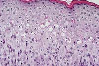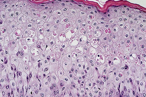 Bacterial invasion stimulates an acute inflammatory response, characterized by superficial dermal edema, and accumulation of large numbers of neutrophils. Neutrophilic exocytosis leads to microabscess formation in the epidermis and the external root sheath. The invaded epidermis prematurely cornifies; within 24 hours postinfection, epidermal regeneration from the adjacent root sheath is established, and by 36 hours a new epidermis has formed under the exudate. Dermatophilus congolensis may cyclicly invade the newly formed epidermis, and stimulate additional bursts of dermal inflammation resulting in an increasingly thick scab composed of alternating layers of ortho- and parakeratosis and degenerating neutrophilic exudate. Any area of skin can be infected, and there is no breed, age or sex predilection.
