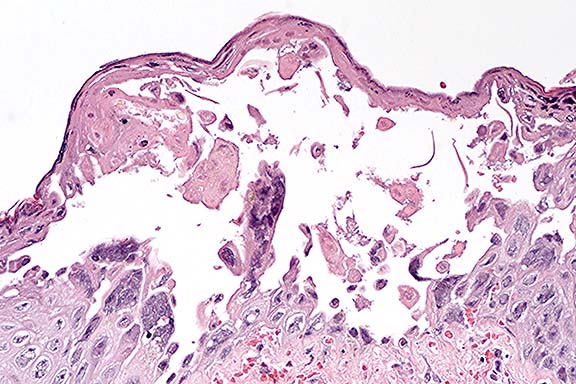 History: This animal developed an acute multifocal to coalescing dermatitis affecting the entire body surface. Affected foci were 0.5 to 1.0 cm in diameter, erythematous, and rarely contained central vesicles (see included gross photos). The animal died during sedation for supportive treatment.