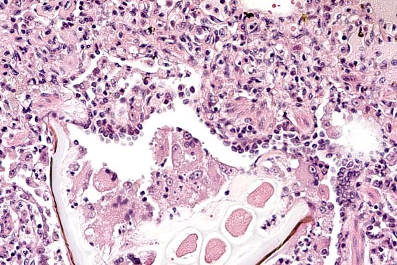 Staphylococcus aureus and Streptococcus pneumoniae are pathogenic cocci that cause pneumonia in primates. In contrast to the present case, S. pneumoniae usually appears as small diplococci and causes a fibrinohemorrhagic pneumonia, often accompanied by fibrinous pleuritis and pericarditis.