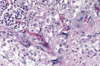 Conference Note: Conference participants discussed the morphologic differences between Aspergillus sp., common pathogens of birds, and Zygomycetes, which are occasionally seen in immunocompromised or debilitated birds. Aspergillus sp. hyphae are typically 3 to 6 mm wide, septate and branched. Branching is dichotomous and often at acute angles. Typical mucoraceous hyphae vary from 5 to 20 mm wide and branch nondichotomously at right angles. The hyphal walls are thin and often become twisted or folded.