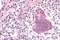 Gross Pathology: A 3 mm nodular mass was adherent to the endocardial surface of the left atrium.