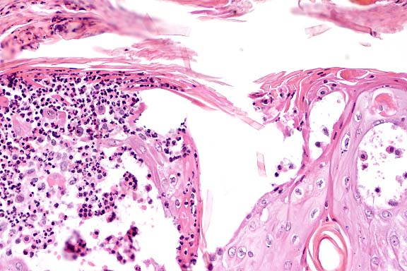 Conference Note: Conference participants considered a differential diagnosis of pemphigus foliaceus (PF) and cutaneous acariasis. Although many of the features of PF are present, there are very few acantholytic cells in many of the sections. Acantholysis is a consistent feature of PF; therefore, participants concluded that a definitive diagnosis could not be made based solely on the histopathology of the submitted section. Cutaneous acariasis can cause a similar histologic lesion, and although no mites were seen, this remains a plausible differential diagnosis.