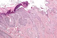 SCC in situ is considered to be rare in cats and very rare in dogs.2 Clinically, affected animals present with one or more erythematous, pigmented, nodular plaques which may be eroded or ulcerated. The plaques are well demarcated from the surrounding haired skin. Lesions may occasionally show local invasion or microinvasion, but metastasis has not been reported. Older cats are most often affected, and there is no known breed predilection.