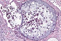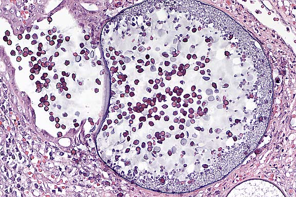 Conference Note: Based only on the morphology of the infecting organism, the differential diagnosis might include coccidioidomycosis and adiasporomycosis. However, the spherules of Coccidioides immitis are generally smaller than rhinosporidial sporangia, and they contain endospores that are generally the same size and shape throughout the spherule. Chrysosporium parvum, the etiologic agent of adiasporomycosis, is larger than Rhinosporodium, has a thicker wall, and does not reproduce by endosporulation.