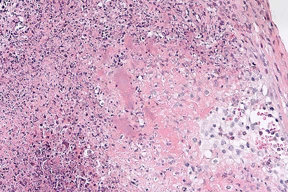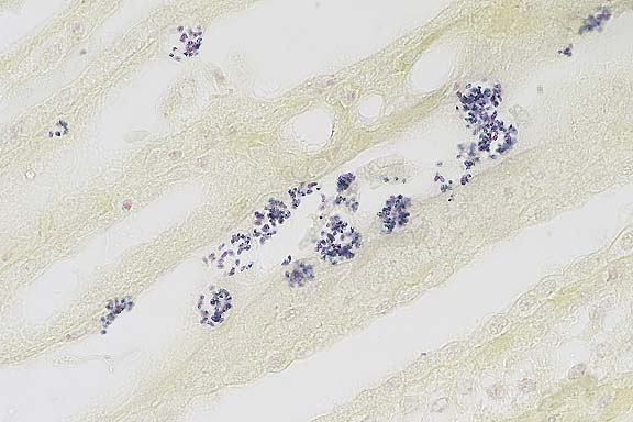 Gross Pathology: The animal was emaciated, flea infested, and had several ticks. The peritoneal cavity contained approximately 10 ml of serous fluid. The spleen was 2x2x6 cm, and multiple disseminated pinpoint to 1 mm white foci were visible on the capsular and cut surfaces. The liver had similar foci. Mesenteric, hilar and mediastinal lymph nodes were enlarged, gray, and friable. Several tapeworm cysts were noted in the peritoneal cavity and attached to the liver and pleura.