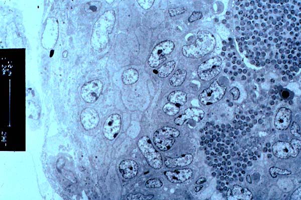 (10-20 mm in diameter) containing electron-dense granular material,
