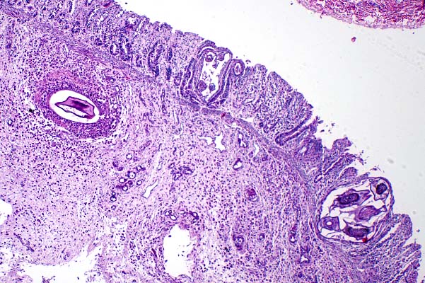 Abundant reddish-brown foci represent embedded nematode (Cyathostome)