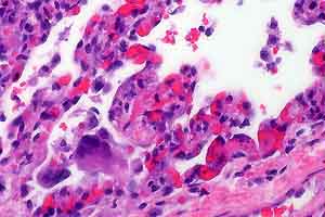 2. Lung, blood vessels: Fibrin thrombi, with yeasts.