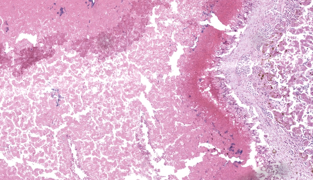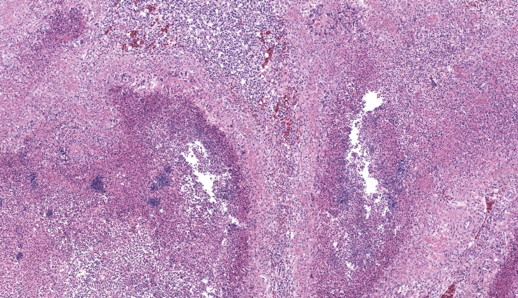 The University of Pennsylvania’s Dr. Nathan Helgert moderated this year’s 11th conference. This is his first time moderating for the WSC, and participants thoroughly enjoyed his quick wit and engaged teaching style. He chose to focus on poultry and ruminant pathology, which participants are always grateful for. This first case was a classic entity with fantastic histologic lesions that, according to some conference goers, provided the perfect moment to make use of the term “geographic” to describe those dramatic areas of necrosis. They truly resemble some beautiful cartography.Conference discussion focused on the diagnostic approach to cases like this one where additional diagnostics are required to “suss out” the etiologic agent. Participants were asked to take a figurative step back and develop a list of possible causes of bacterial sepsis in chickens that could lead to hepatic and splenic lesions like these. The list included E. coli (colibacillosis), Salmonella typhimurium, Staphylococcus aureus, Enterococcus spp, Streptococcus spp.,Erysipelothrix rhusiopathiae (although this is more likely in turkeys and pheasants than in chickens), Mycobacterium spp (especially M. avium), and Pasteurella multocida, to name just a few. Some of these look nearly identical to one another both grossly and histologically, while others of these have more distinct features. Either way, culture and special stains will be needed.