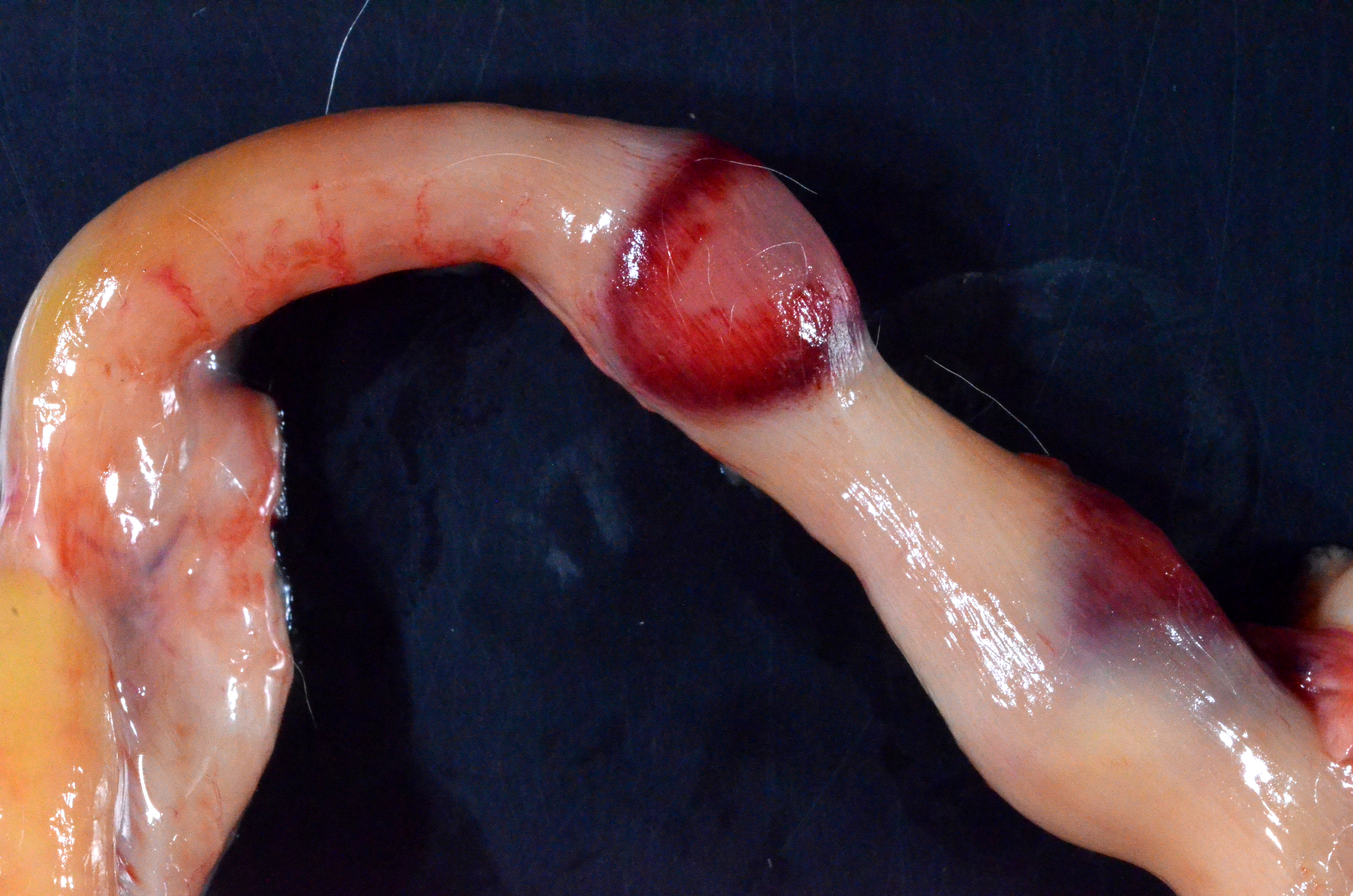 Gross Pathology: The subcutis is diffusely expanded by up to 1 cm of gelatinous, translucent, pale yellow material (edema).On the serosal surface of the distal colon are two, 10 x 15 x 4mm, ovoid, expansile, targetoid (pale pink center surrounded by a hyperemic rim) foci, located 15mm apart and approximately 2cm orad from the anus. The corresponding colonic mucosa of these foci is friable thickened up to 8 mm thick, with an irregular corrugated mucosal surface that is mottled tan to brown, with a central area of pasty, white exudate (pus, ulceration and necrosis).