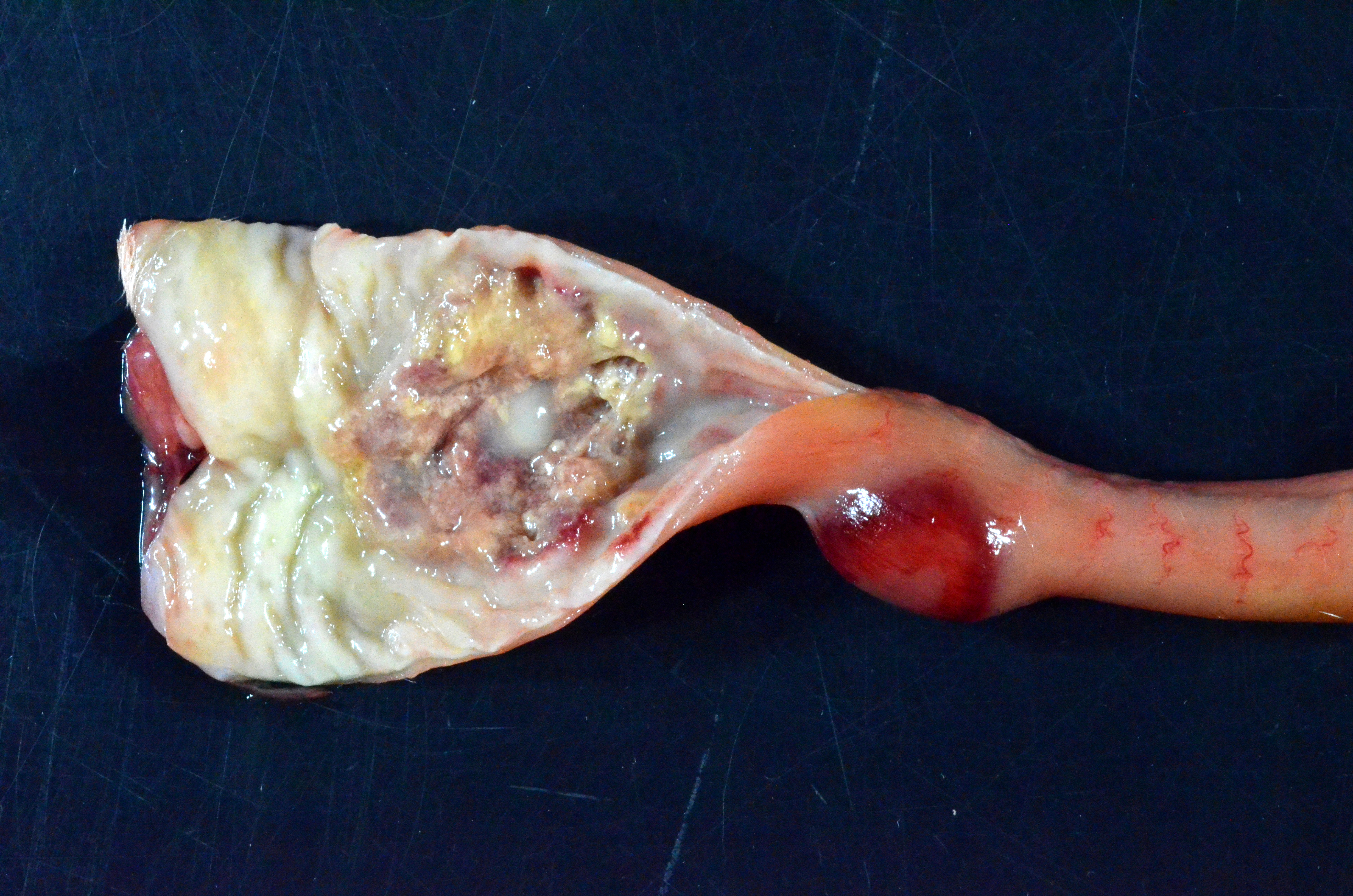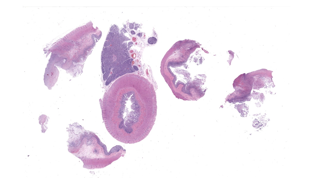 - Duodenum: Duodenitis, ulcerative, subacute, multifocal, moderate.