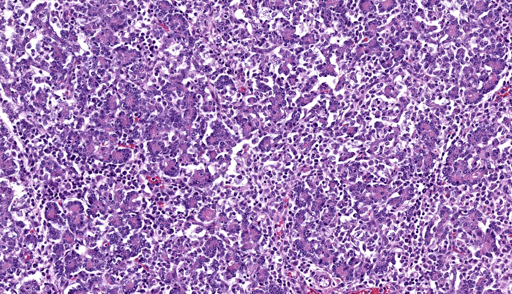 - Pancreas: Pancreatitis, lymphoplasmacytic and histiocytic, subacute, diffuse, marked, with acinar atrophy.