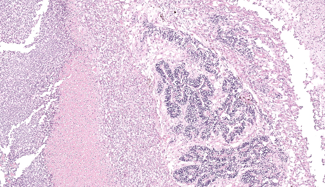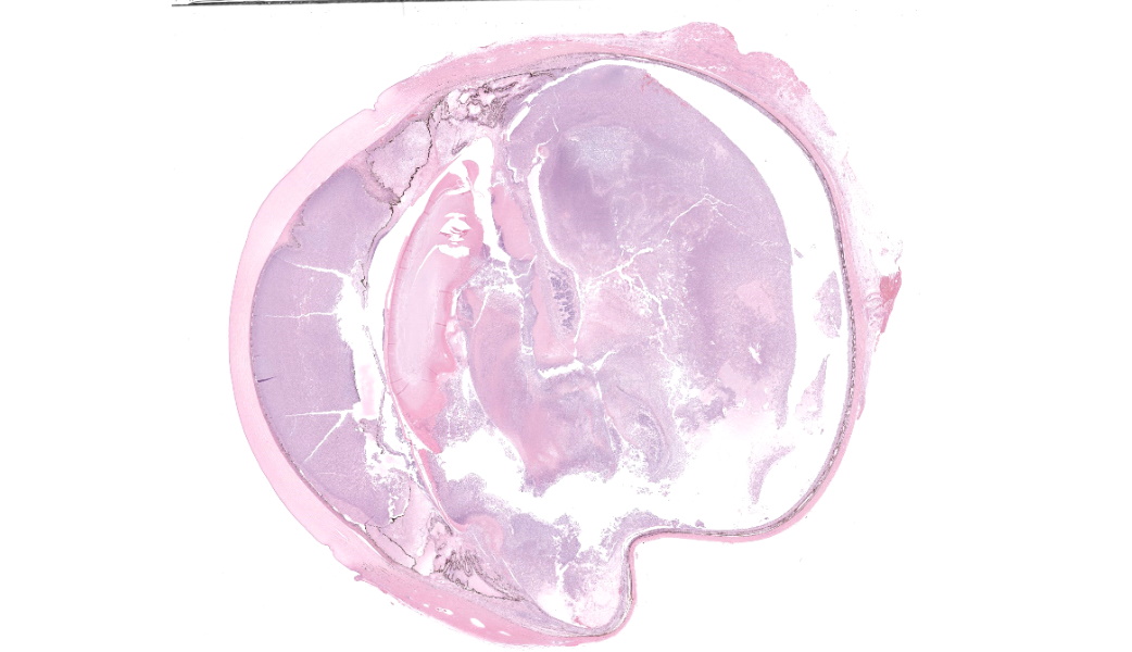 Talk about a descriptive case that made, for obvious reasons, an excellent sales pitch on why pathology is the best profession! This case provides an excellent opportunity for participants to push themselves on their ocular descriptive abilities. Many thanks to this contributor for a fantastic case! Much like the previous eye case in this conference, there was substantial discussion on ocular pathology. The most informative nuggets from that conversation included utilizing the lens capsule, which is an easily identifiable structure in the eye, to assist with orientation in a busy ocular slide such as this one. The pigmented irideal stroma, as well as the “golden” fibers of the iris, can also be used to help identify structures that might otherwise be difficult to ascertain due to the degree of damage and/or inflammation.This case had beautiful examples of iris bombe (iris pushed forward into the anterior chamber and adhered to the back of the cornea), numerous types of fibrovascular membranes (retrocorneal, preiridial, cyclitic, etc.), and a fantastic phakoclastic panuveitis from lens rupture. The six types of uveitis and their definitions were discussed and included: 1) anterior uveitis (inflammation of the iris and ciliary body), 2) posterior uveitis (inflammation of the ciliary body and choroid), 3) panuveitis (iris, ciliary body, and choroid affected), 4) chorioretinitis (inflammation of the choroid and retina), 5) endophthalmitis (inflammation of uvea, retina, and ocular cavities), and 6) panophthalmitis (all ocular structures are affected, including sclera). Being able to recognize and accurately use these terms as pathologists can provide crucial information to ophthalmologists when it comes to treating these patients.