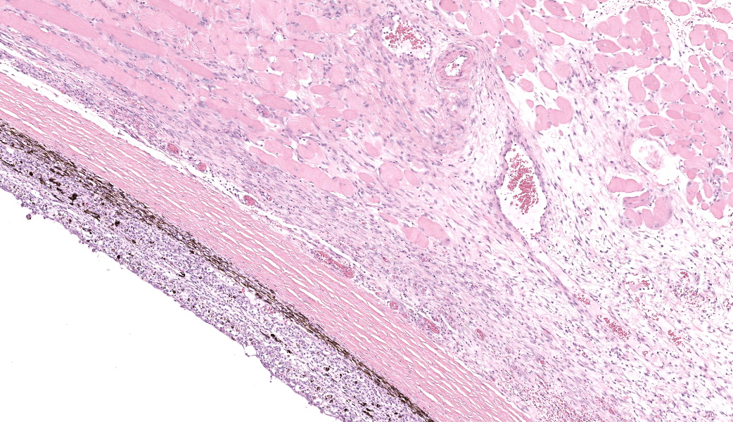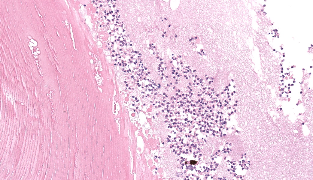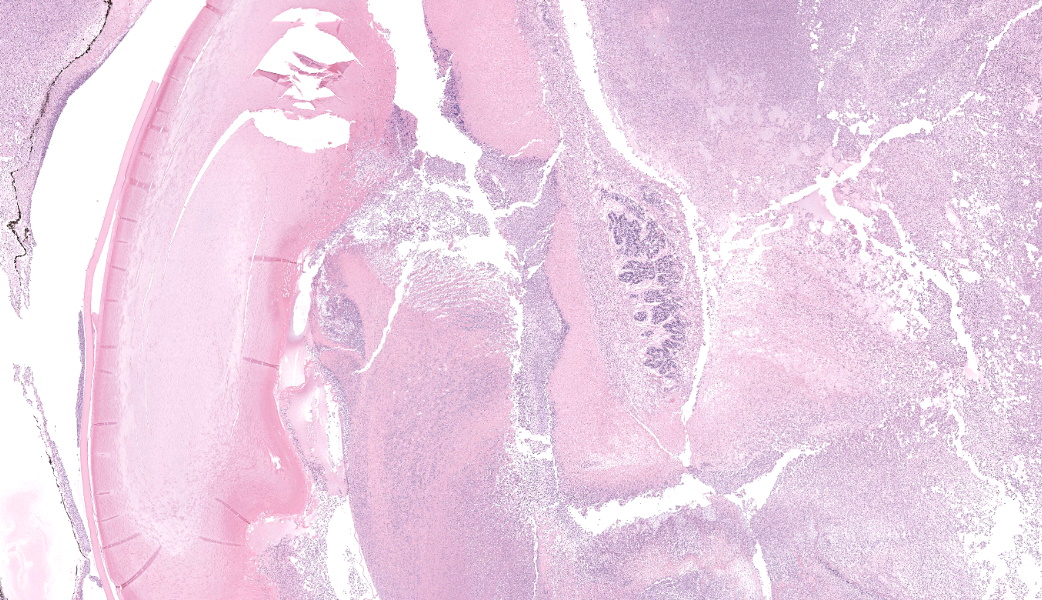 Filling all ocular chambers and coating the surfaces of intraocular structures are vast accumulations of exudate consisting of myriad degenerate and intact neutrophils, many macrophages, abundant amounts of fibrinous to proteinic material, abundant necrotic cellular debris, occasional pools of extravasated erythrocytes, and multifocal colonies of mixed bacteria (rods and coccobacilli). Centrally incorporated into the inflammatory exudates is a ruptured lens which lacks a capsule in many areas and has highly undulating free capsule margins regionally. The lenticular stroma is variably vacuolated with the following features: streaks of pallor, Morgagnian globules, many infiltrating leukocytes (mostly neutrophils), and occasional pockets of similar bacteria. The retina is diffusely detached and largely inapparent apart from remnant segments of atrophied and degenerate retina enmeshed within the exudate. Suppurative to pyogranulomatous inflammatory infiltrates multifocally extend into the iris, ciliary body, choroid, optic nerve which is significantly gliotic with rarefied neuropil, and optic nerve meninges. The iris is displaced anteriorly and multifocally abuts the posterior aspect of the cornea. The anterior chamber is severely narrow, and the drainage angle is collapsed and inapparent. The corneal stroma is moderately to markedly oedematous and contains small to moderate numbers of scattered neutrophils. The anterior corneal epithelium appears attenuated in areas. The sclera is variably thinned with multifocal often perivascular infiltrates of lymphocytes and plasma cells with variable numbers of admixed neutrophils and occasional macrophages. There are increased numbers of perilimbal pigmented cells. A thin to moderately thick layer of oedematous and inflamed granulation tissue regionally lines the mid and posterior scleral margins outside the globe and extends into a bundle of periocular skeletal muscle. In addition to infiltrates of the aforementioned inflammatory cells, the granulation tissue also contains many golden-brown pigmented macrophages (siderophages) which are concentrated at the level of the ciliary body. There is abundant haemorrhage in the retrobulbar loose connective tissue.Contributor's Morphologic Diagnoses: