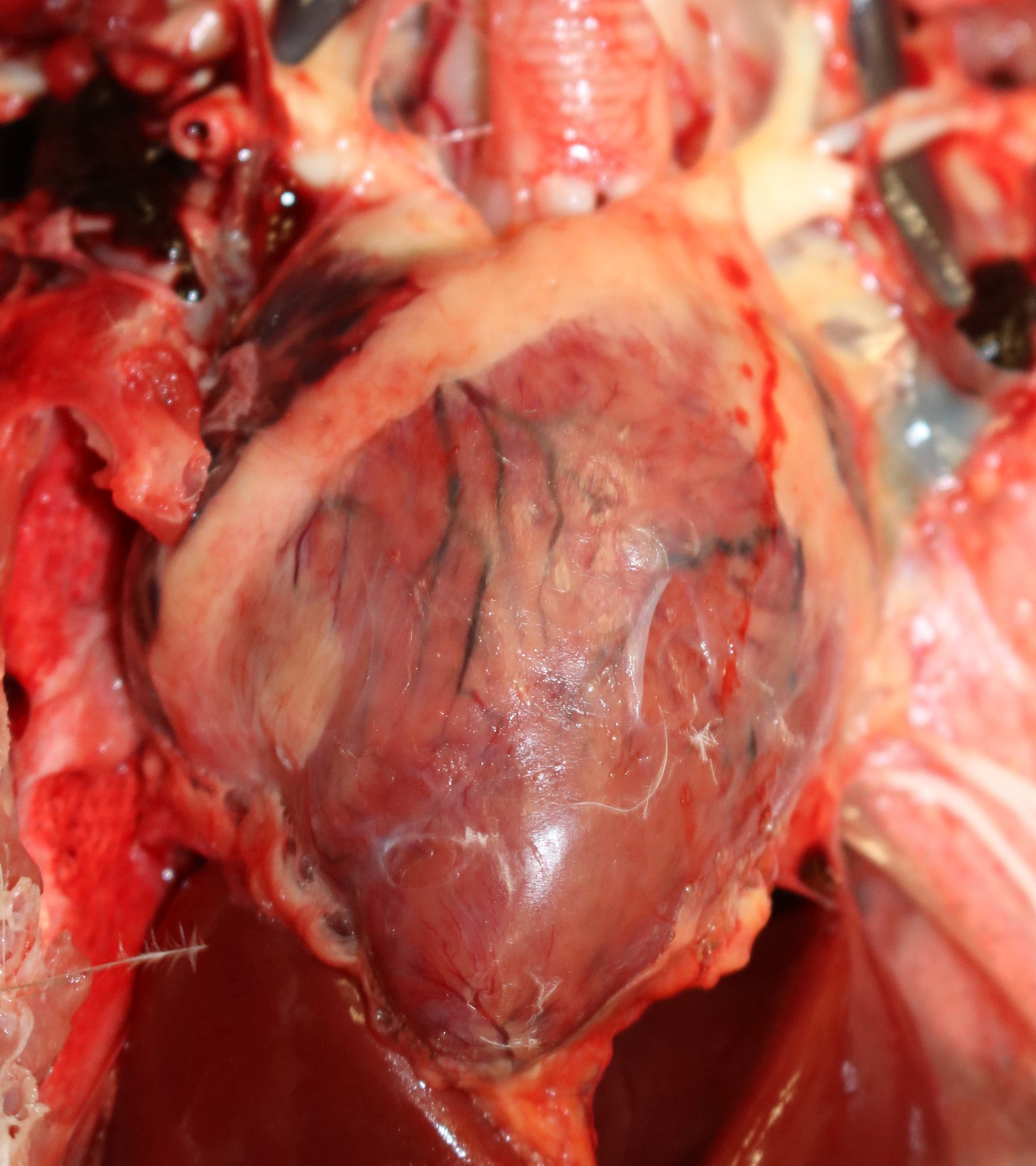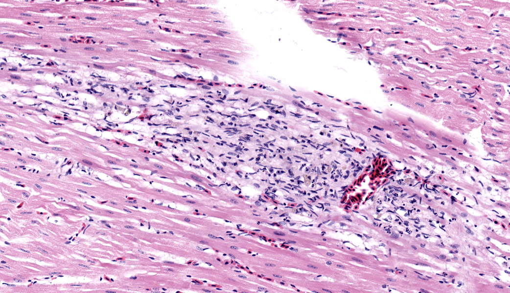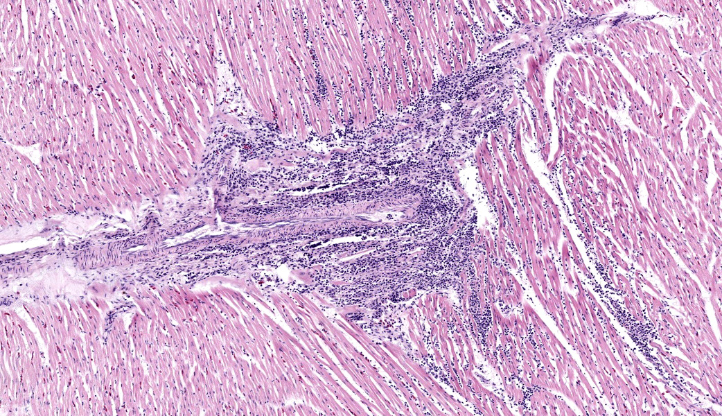- Heart: Myocarditis, lymphoplasmacytic and histiocytic, chronic, multifocal, moderate, with cardiomyocyte necrosis.