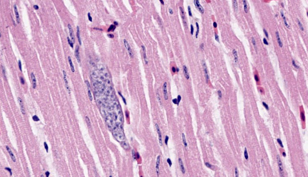 - Heart, cardiomyocytes: Intrasarcoplasmic apicomplexan schizonts, multiple.
