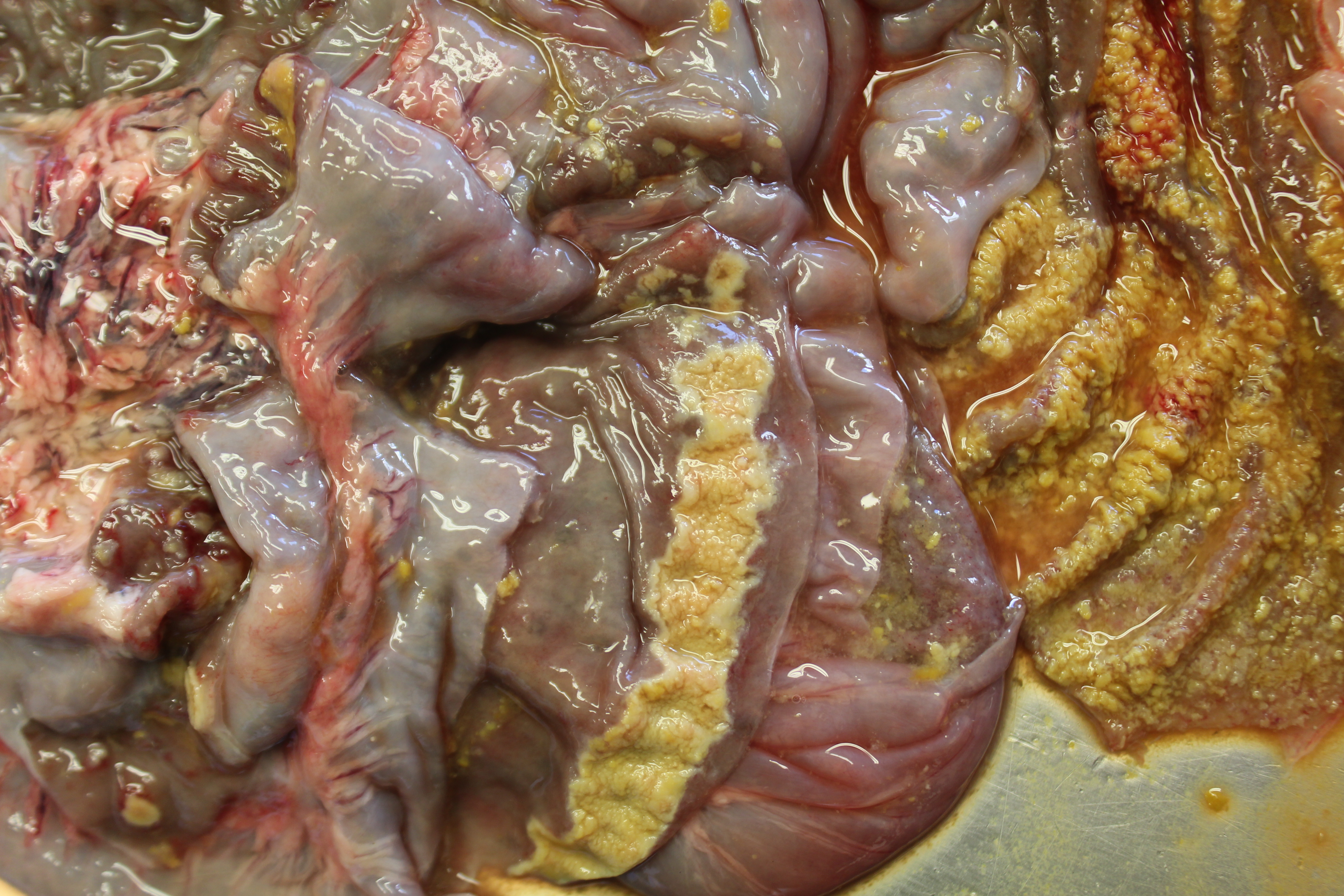 Contributor?s Morphologic Diagnoses: Large intestine: fibrinous to necrotizing enteritis, severe, chronic, multifocal to coalescing