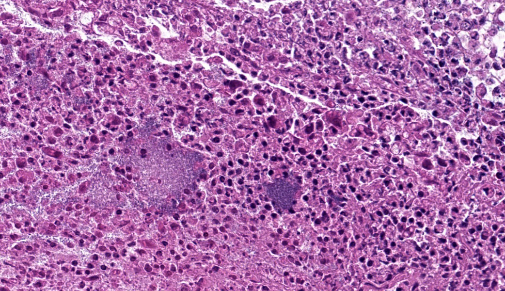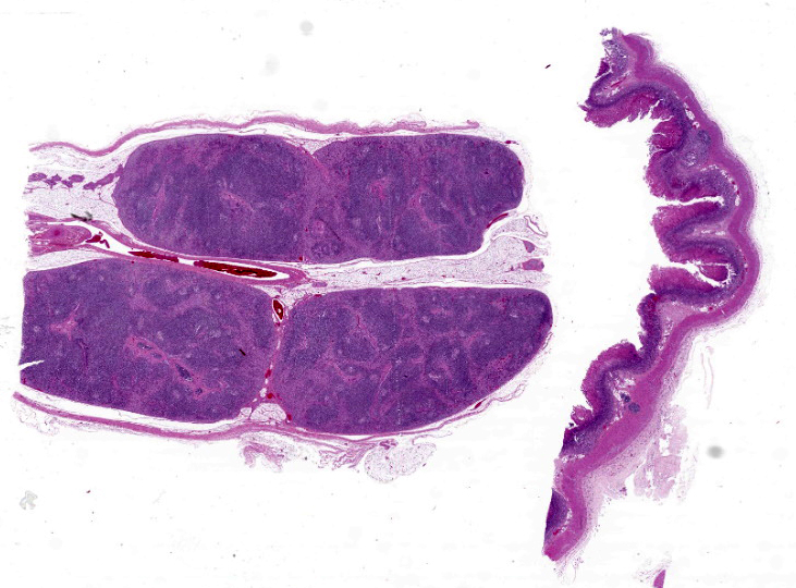Mandibular lymph node: Lymphoid follicles are indistinct as a result of a severe lymphocyte depletion and replacement by aggregates of epithelioid macrophages with abundant eosinophilic cytoplasm.
