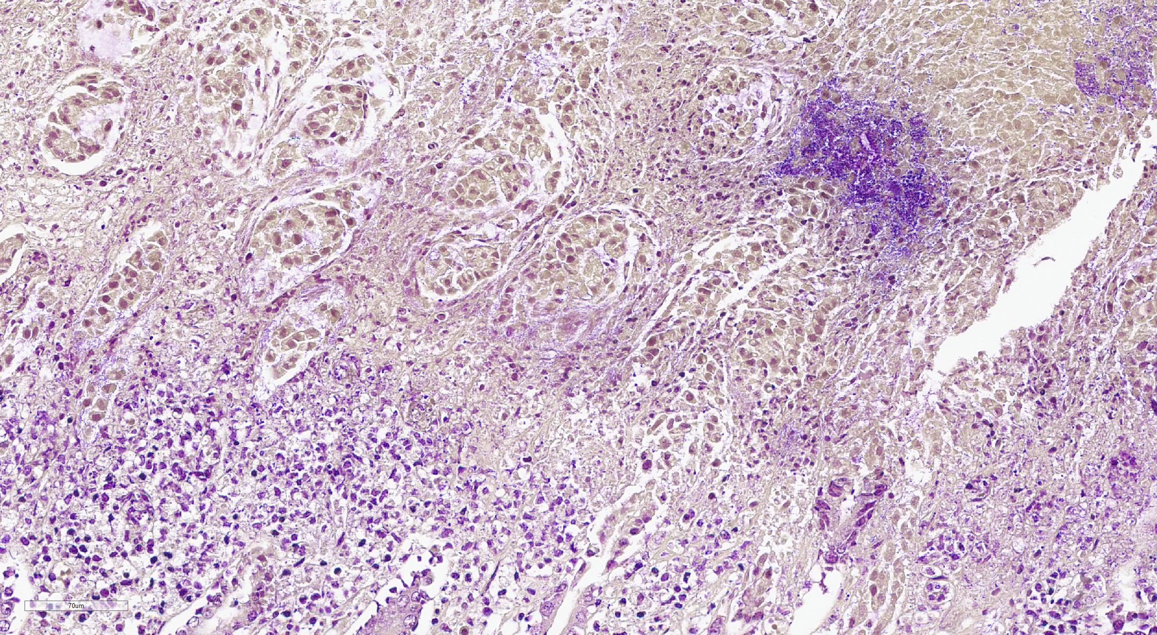 Immunohistochemistry examination: Immunohistochemistry using an antibody directed against PCV-2 antigen revealed positive labeling in the cytoplasm of the epithelioid macrophages.