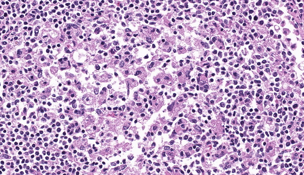 There was discussion on the difference between lymphoid necrosis and lymphoid depletion, the former of which implies active targeting of lymphocytes while the latter can be an aftermath of lymphoid necrosis or can be a separate process secondary to any number of pathogeneses (i.e. SCID). The target cell for porcine circovirus-2 is macrophages, and a classic case of PCV-2 may result in granulomatous lymphadenitis, an unusual result of most viral infections. Lymphocytes are not directly targeted in the pathogenesis of PCV-2 but are rather secondary victims to the inflammation from immune response to the virus, making this case a great example of lymphoid depletion. This is further exacerbated in cases of secondary bacterial infection when the offending bacteria colonize Peyer?s patches, which is an important step in the pathogenesis of enteric salmonellosis.