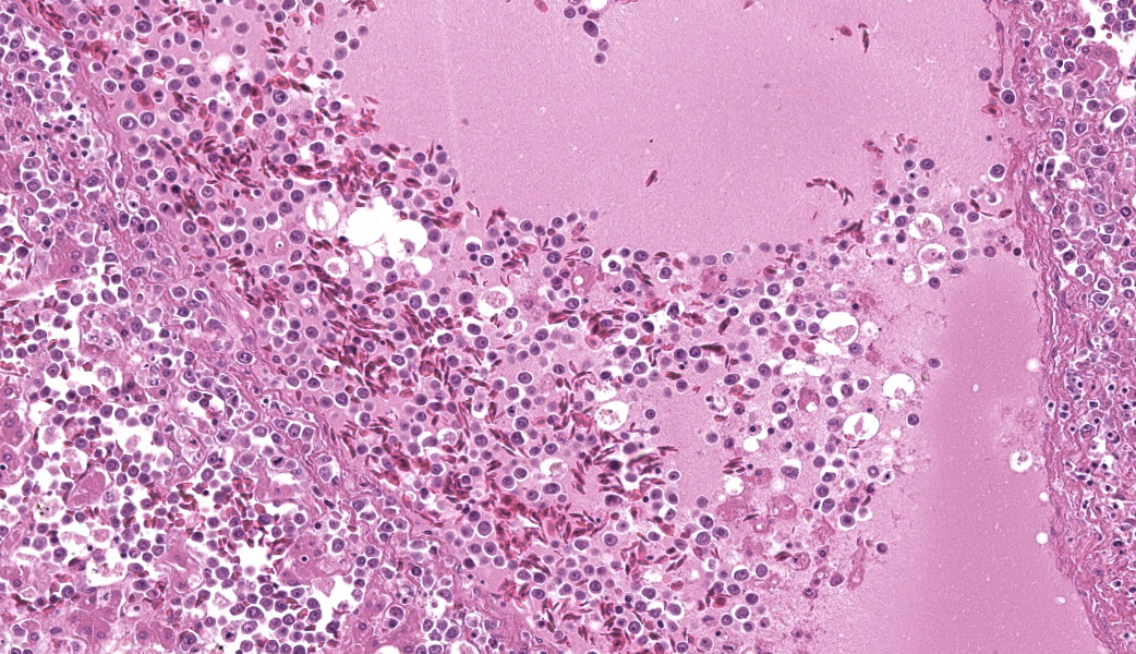 This case proved to be challenging for participants given that the condition is relatively obscure and requires IHCs for definitive diagnosis. Leukemia and leukemic lymphoma were the top diagnoses considered by conference participants prior to case discussion. The contributor provides an excellent overview of and a convincing diagnostic workup for the diagnosis of avian erythroblastosis in their comment. An in-house hemoglobin IHC at the JPC similarly revealed moderate cytoplasmic immunoreactivity for hemoglobin within the neoplastic cell population and no immunoreactivity of neoplastic cells for lymphocyte markers (CD3, CD20, PAX5, CD34). This entity, and its accompanying histologic findings, provided great discussion of oncogenic viruses and intravascular round cell neoplasms of avian species. “Intravascular round cell neoplasm” was ultimately the morphologic diagnosis that was favored by the JPC due to the inability to reach the diagnosis of erythroblastosis on the H&E slide alone (the JPC morphologic diagnosis is always based on the HE section, which is the only section provided in advance of the conference.)Conference discussion focused largely on avian leukosis virus and its subtypes. Avian leukosis viruses (ALV) are alpharetroviruses that are usually slowly oncogenic. Subtype A is the most common, and subtypes A through E, as well as J, are known to infect chickens. Other subtypes affect numerous other species of birds. These viruses cause a variety of neoplasms by inserting themselves as promoters into the affected chicken’s genome near a cellular proto-oncogene, such as c-erbB, causing overexpression of the proto-oncogene. This overexpression leads to downstream dysregulation of cellular division and promotion of uncontrolled cell growth. Et voila, a neoplasm is produced! Such neoplasms include erythroblastosis, lymphomas (usually B-cell with IgM production), myelocytomatosis (subtype J), and various sarcomas.