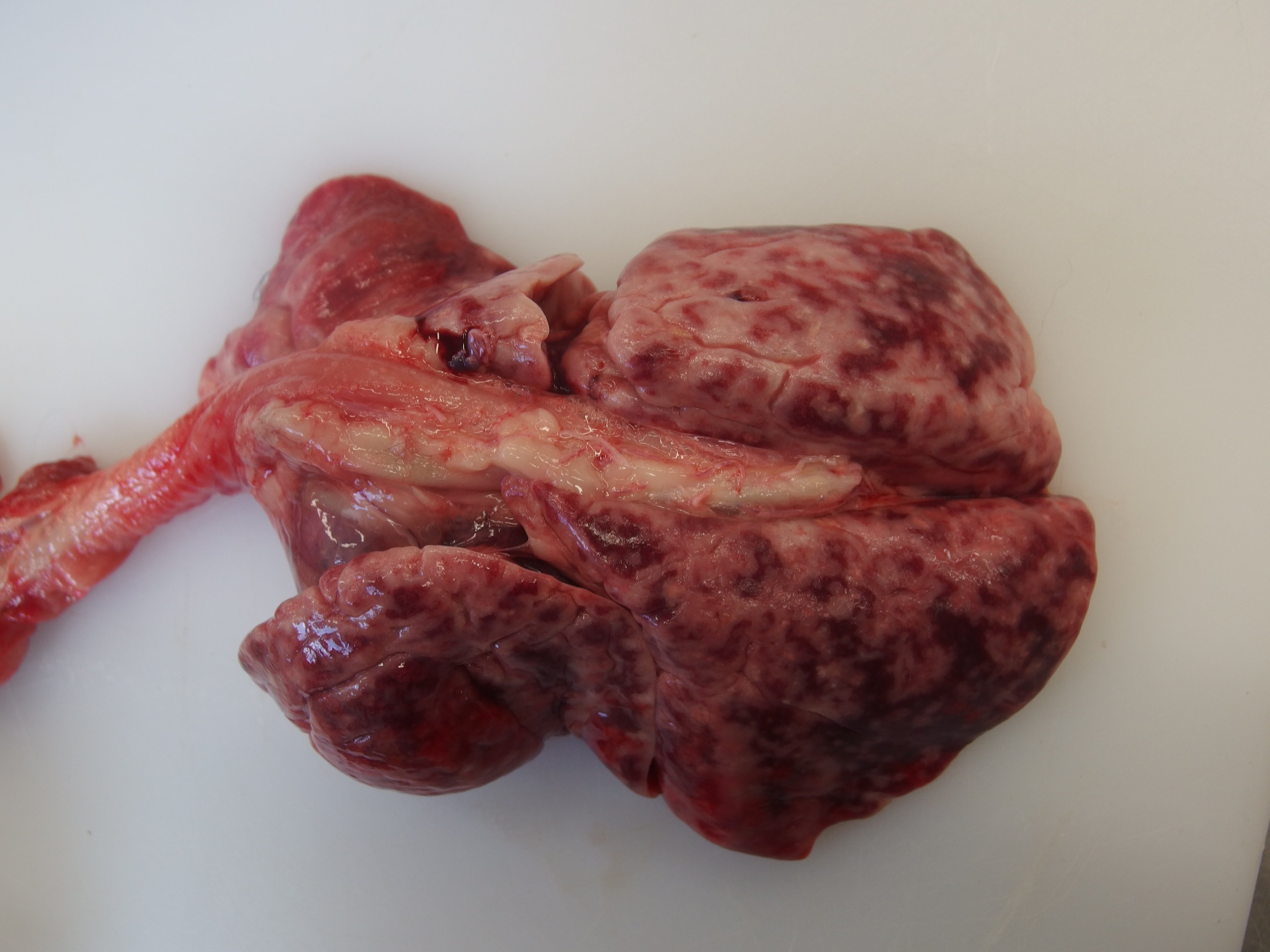 Gross Pathology: Diffusely all lung lobes were markedly expanded by moderately firm red-cream tissue. The pleural surfaces were smooth despite the lungs being expanded.The pericardial sac contained approximately 2mL of serosanguinous fluid. The heart weighed 28 g (cardiomegaly, <20g is considered normal). Cross section of the left ventricular free wall, interventricular septum, and right ventricular free wall measured 6 mm, 6 mm, 3 mm respectively (cardiac hypertrophy with right ventricular free wall most prominently affected). This results in a ratio between the chamber widths of 2:2:1. The left and right auricles were approximately 15 mm in length and width, and 5-10 mm in depth, and were both similar sizes (bilateral auricular dilation).