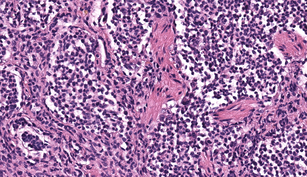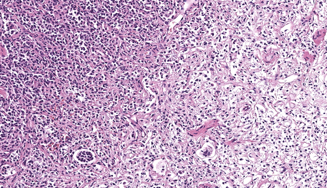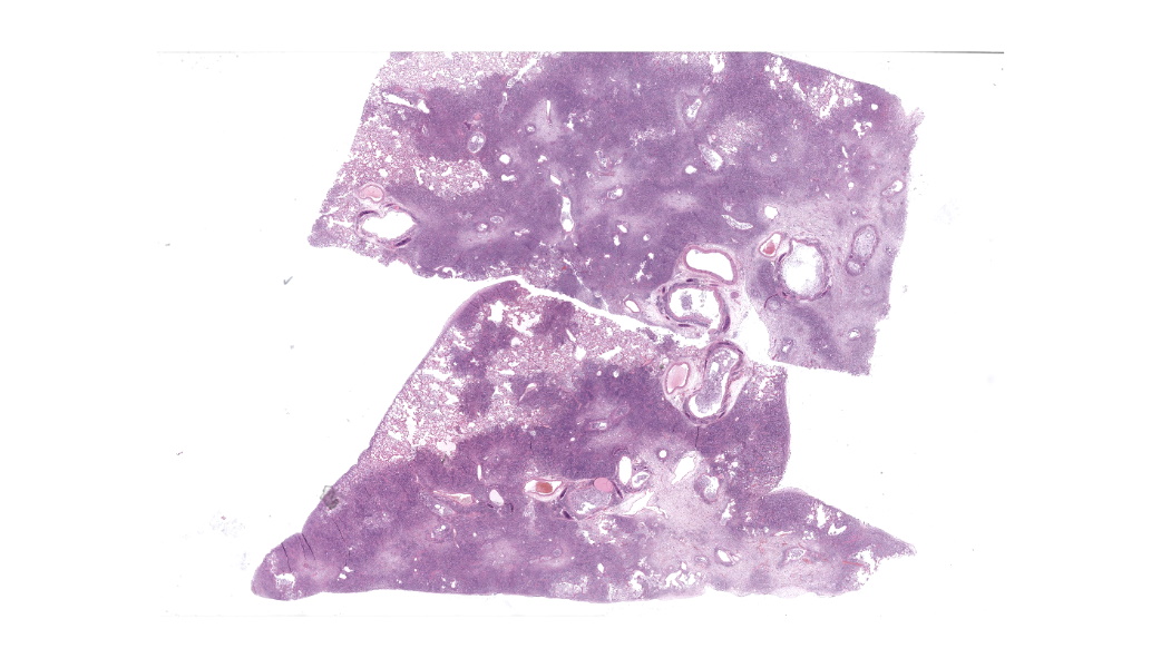 Expanding the airway and alveolar interstitium, subpleural spaces and also filling alveolar spaces, there is a proliferation of large numbers of round-polygonal cells. The proliferative round cell population have a moderate amount of eosinophilic cytoplasm and a reniform nucleus that contains coarsely stippled chromatin and a single nucleolus. There is mild anisocytosis and anisokaryosis, and there are occasional multinucleated cells. There is one mitotic figure per 2.37 square mm. Within the pleural, peribronchiolar interstitium and alveolar septa, the proliferative cells are accompanied by fine strands of collagen, resulting in further expansion of those structures, and in some areas, complete effacement of the normal pulmonary architecture with obliteration of air spaces. In non-consolidated areas, alveolar septa are multifocally ruptured (microscopic emphysema). There is multifocal, moderate, hyperplasia of bronchiolar smooth muscle, and occasionally, especially in subpleural areas, there is type 2 pneumocyte hyperplasia. Medium-sized pulmonary arteries demonstrate hyperplasia of the tunica media. Airway epithelium is frequently sloughed (post-mortem artefact). Gram, Ziehl-Neelson and PAS-stained sections do not highlight micro-organisms.Contributor's Morphologic Diagnoses: