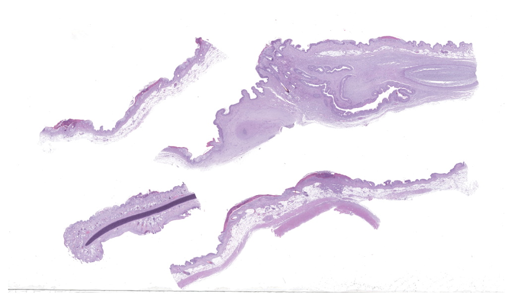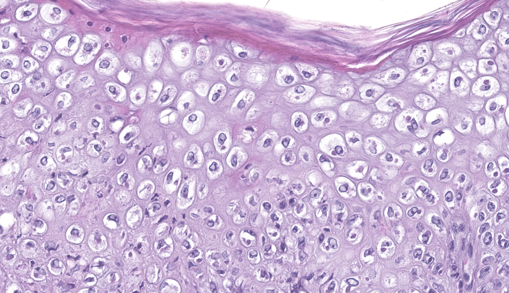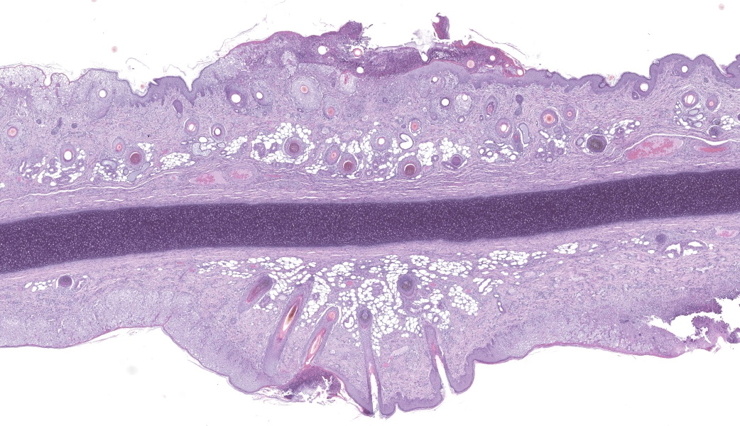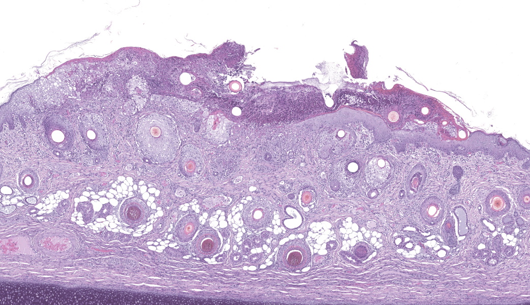 Haired skin (ear, prepuce, and inguinal area): affecting 20% of the evaluated section there is a proliferative and necrotizing process that mainly affects the epidermis. The epidermis and hair follicle epithelium show the following features: stratum corneum with diffuse mild compact hyperkeratotic orthokeratosis with multifocally serocellular crusts composed by cellular debris, degenerated keratin, degenerated neutrophils, and multiple superficial coccoid bacterial colonies (secondary contamination). Also, stratum spinosum shows multifocal marked thickening (acanthosis), and numerous keratinocytes display ballooning degeneration and intracytoplasmic perinuclear 2-5 ?m eosinophilic inclusion bodies. Multifocally, in the most affected areas, there is marked neutrophilic exocytosis, and numerous keratinocytes lost intercellular connections and undergo lytic necrosis. Superficial and mid dermis show perivascular to diffuse, moderate to severe inflammatory infiltrates composed by viable and degenerated neutrophils, macrophages, and lesser numbers of lymphocytes and plasma cells. Significant lesions were not seen in the hypodermis.Contributor's Morphologic Diagnoses: