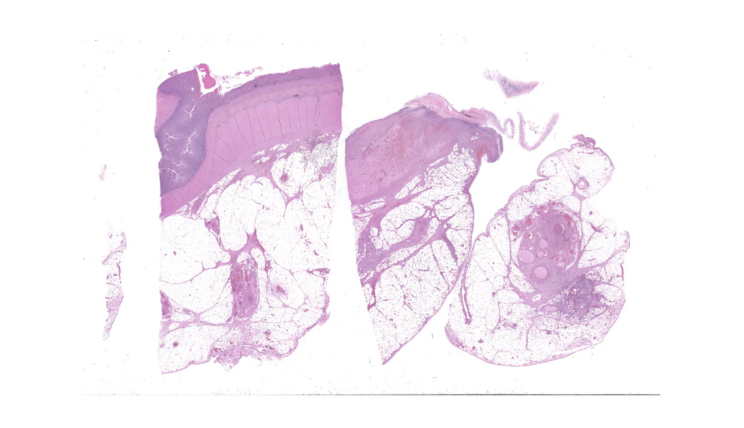- Small intestine: Enteritis and peritonitis, necrotizing and eosinophilic, chronic, regionally extensive, severe.