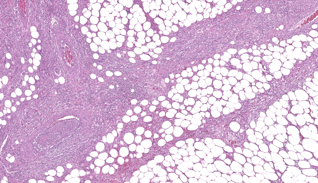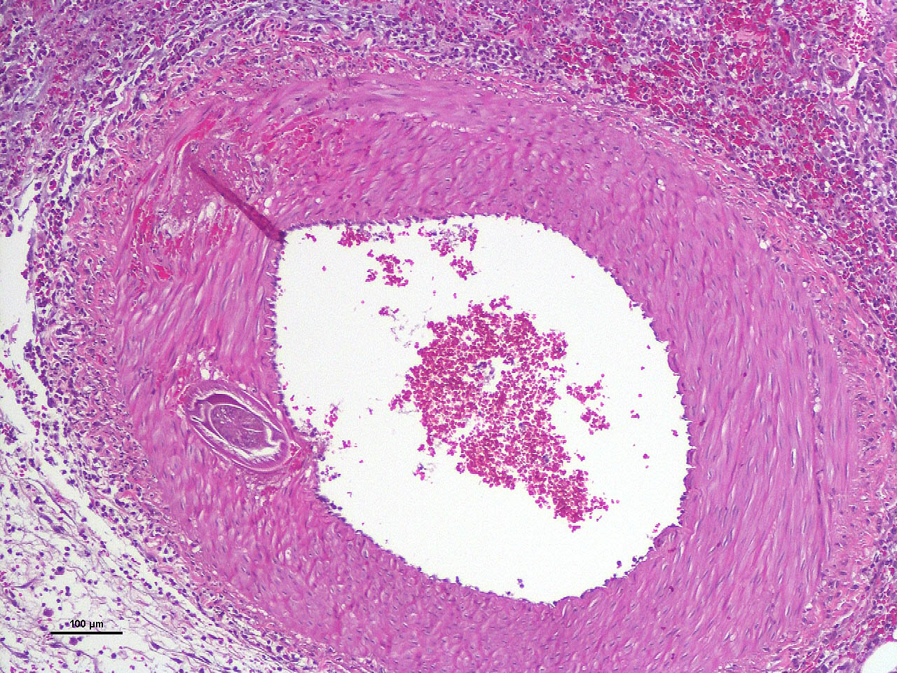 - Mesentery: Arteritis and periarteritis, necrotizing and eosinophilic, chronic, multifocal, severe, with arterial thrombi and rare larval spirurids.