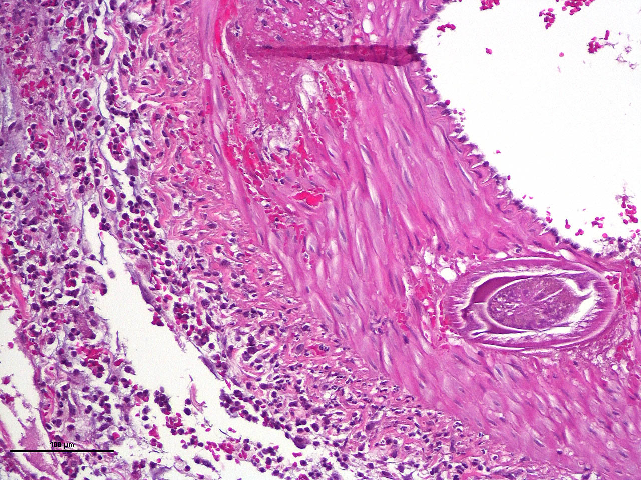 Aortic lesions associated with Spirocerca include intimal and medial hemorrhage and necrosis with eosinophilic inflammation, thrombus formation and rarely rupture of the aortic wall.1,2,7