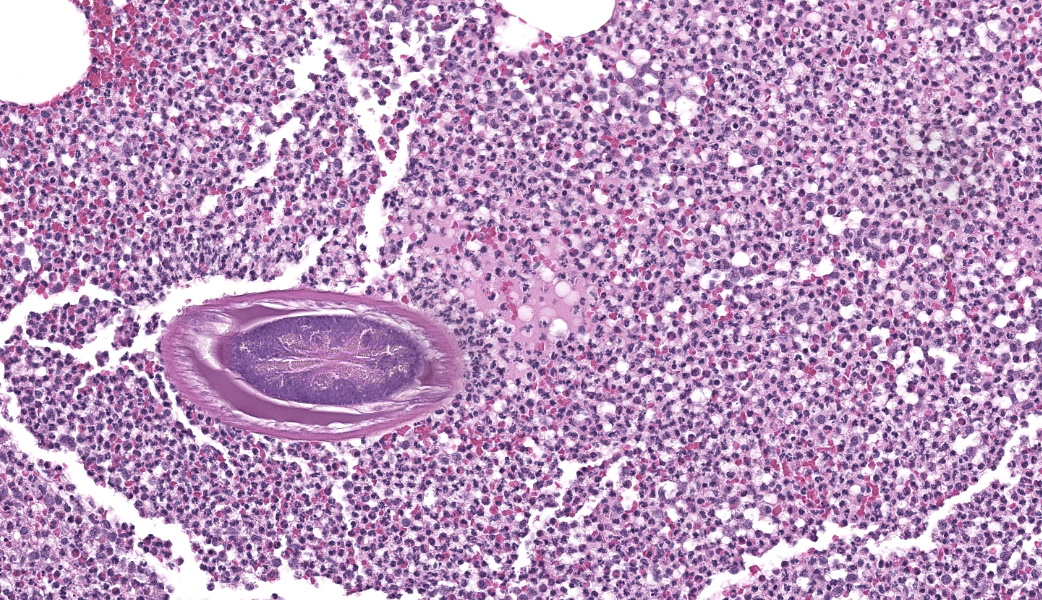 Yet another parasite within veterinary species that is well-known to induce malignant neoplasms is Cysticercus fasciolaris, the larval form of the cestode Taenia taeniaformis. This larval tapeworm can induce the formation of fibrosarcomas in the liver of infected rats.5 There is a short list of additional parasites associated with the development of neoplasia, but the body of literature has not yet established a direct causal link between these neoplasms and the parasites themselves. These include: Trichosomoides crassicauda, the urinary bladder threadworm of rats that, although not directly carcinogenic in and of itself, is associated with the development of urothelial carcinomas via the creation of a chronically irritated environment within the urinary bladder that may be more receptive to the effects of external carcinogens; Heterakis gallinarum and H. isolonche, cecal nematodes of avian species, induce granulomatous nodule formation that can eventually progress to leiomyomas; and Trichuris muris, an intestinal-dwelling nematode of mice, can induce chronic cecal irritation that can develop into intestinal neoplasms.5,8 Keeping these tiny not-friends on a short list of carcinogenic or cancer-associated parasites is crucial to the pathologist’s differentials list when faced with cases where their consideration is warranted.