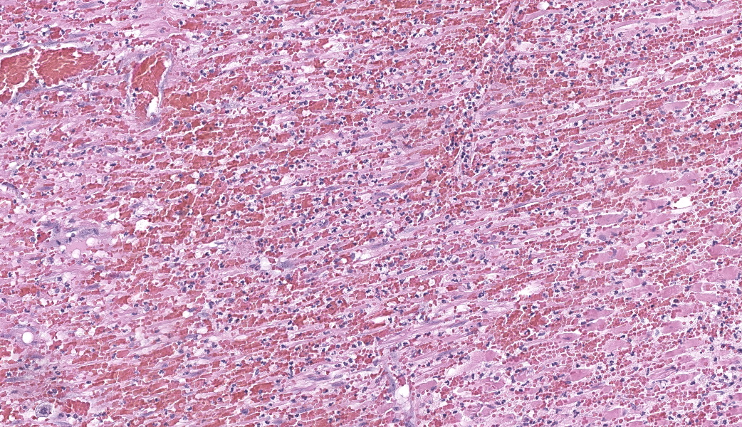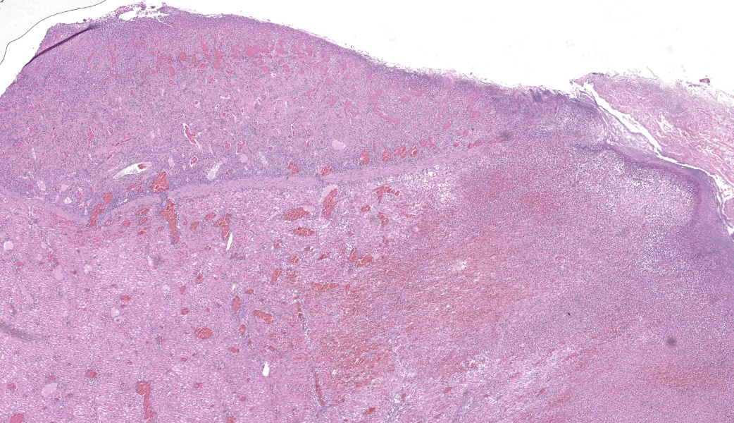 Findings are very similar in all cases that were submitted to the diagnostic laboratory.In all samples from the grossly discolored and swollen segment there was transmural necrosis of the intestine with extensive hemorrhage extending into the mesenteric fat. In the adjacent viable intestine there was eosinophilic infiltration of variable intensity. There was multifocal necrosis of mesenteric fat and, in some sections, diffuse eosinophilic infiltration. Large vessels were dilated and many contained thrombi.