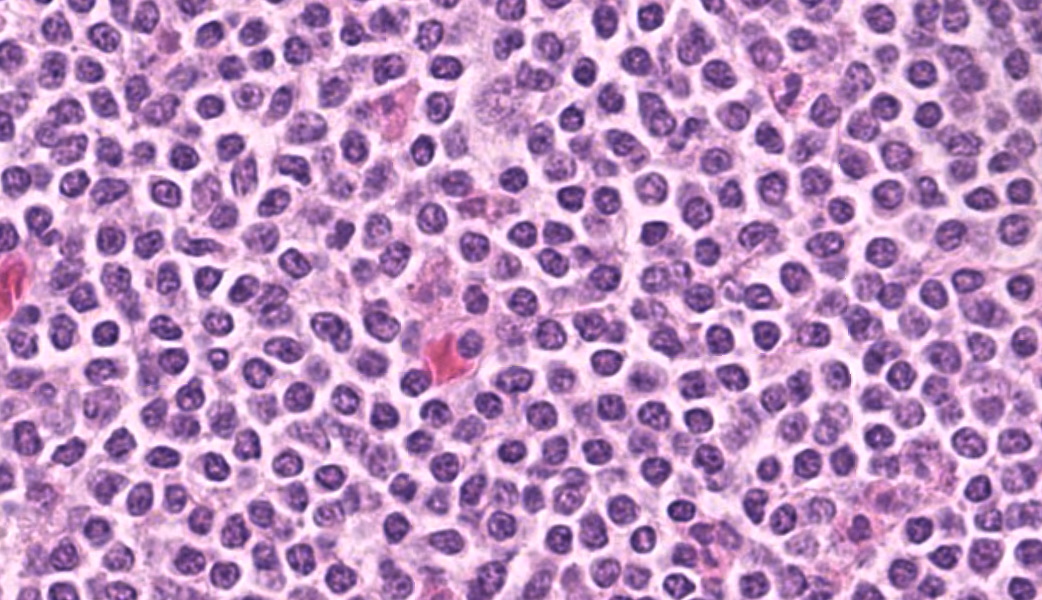 Camel; Paratracheal Lymph NodeDescription Multifocally the normal architecture of the cortex, paracortex and medulla is disrupted and replaced by a densely cellular neoplasm composed of lymphoid cells. The neoplasm is comprised of sheets of closely packed small round cells with nuclei 5-7µm in diameter. Cells are mostly round with indistinct cytoplasmic margins, scant basophilic or eosinophilic cytoplasm, high nuclear to cytoplasmic ratio, and a paracentric nucleus with coarsely clumped chromatin. There is mild anisocytosis and anisokaryosis. There is an average of 12 mitoses per 2.37mm2. Within the capsule of the lymph node there are small aggregates of neoplastic cells organized into sheets.