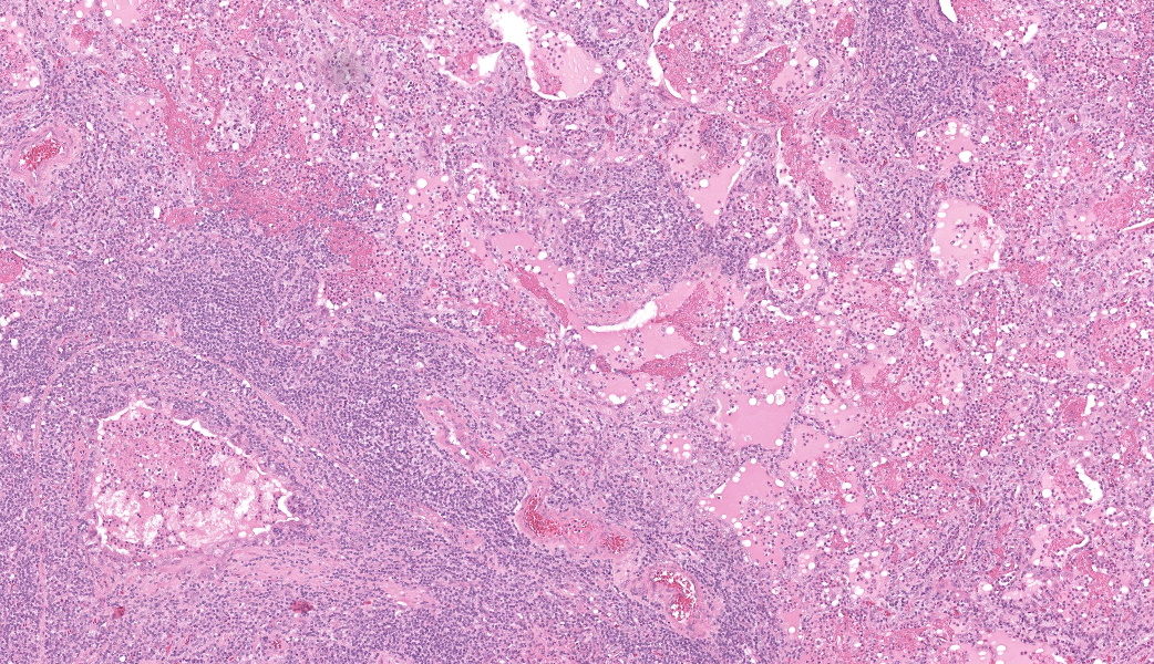 Lung and Lymph node; B-cell lymphomaLung; bronchopneumonia, fibrinosuppurative, multifocal, severe, subacute, with type II pneumocyte hyperplasia.