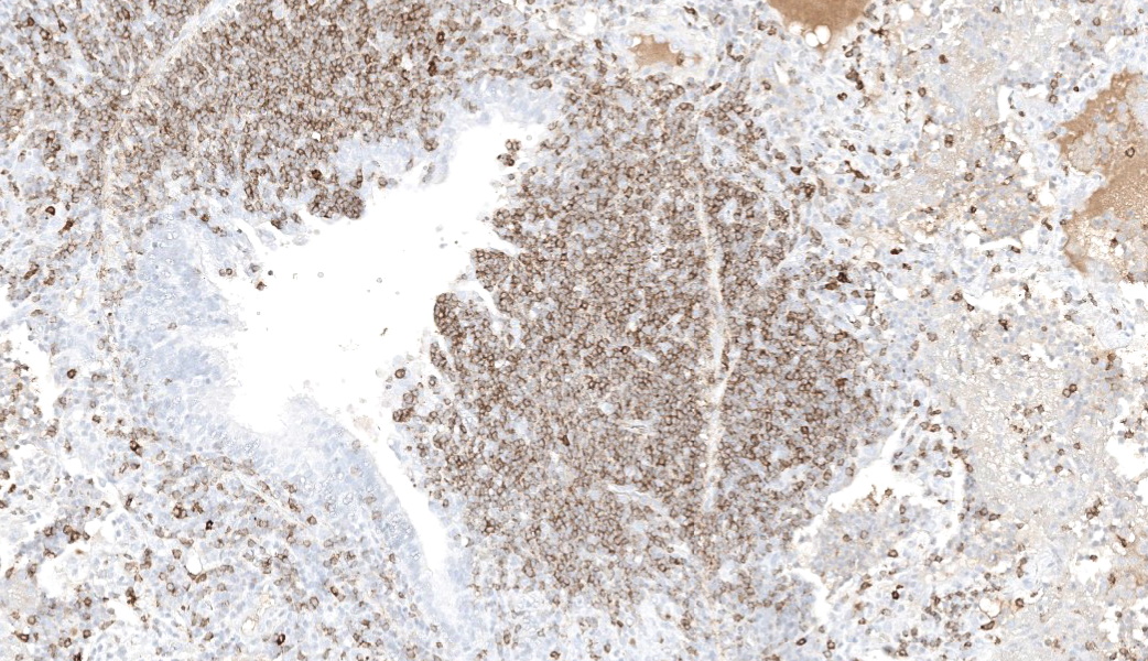 Moderate numbers multifocally throughout the medulla |