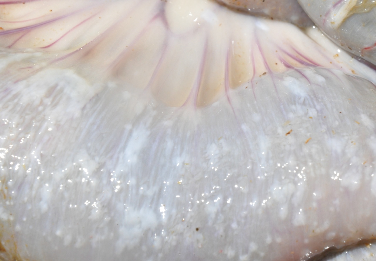 The serosa of the small intestine, caecum and colon was covered in miliary to focally extensive firm, white, raised plaques. In some areas, the plaques were as small as 1mm diameter, pinpoint lesions, whereas in others as much as 90 percent of the serosal surface was covered.