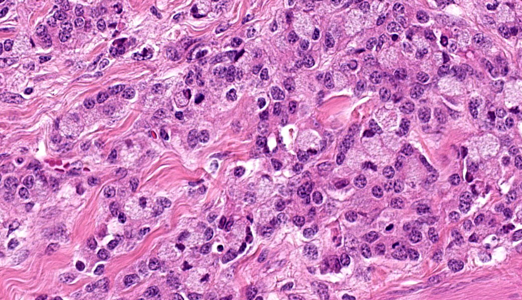 Colon: The lamina propria, submucosa, muscularis mucosa and serosa are markedly expanded by a poorly demarcated, non-encapsulated, infiltrative neoplasm composed of two populations of neoplastic epithelial cells. The neoplastic cells occur singly and in loose packets, lobules and cords, and are supported by variable fibrous stroma containing fibrocytes, fibroblasts and a light basophilic matrix. The predominant neoplastic cell is round to ovoid, 20–50 μm in diameter, with distinct cell borders, abundant finely granular basophilic cytoplasm, peripherally located oval nuclei with lightly stippled pale chromatin and single nucleoli. The secondary type of neoplastic cell is round to oval; 15-30 μm in diameter; with distinct cell borders; moderate amounts of cytoplasm containing small eosinophilic granules; single, peripherally located, large nuclei with coarse chromatin and single nucleoli. Both sub-populations of neoplastic cells exhibit moderate anisocytosis and anisokaryosis. Mitoses are rare (< 1 per HPF). There is moderate expansion of the adventitia of large vessels with neoplastic cells. The lamina propria propria is diffusely expanded by moderate numbers of lymphocytes, plasma cells, occasional macrophages and rare eosinophils. Crypts are often ectatic, lined with attenuated epithelium and containing non-degenerate neutrophils, rare macrophages and lymphocytes (crypt abscess).