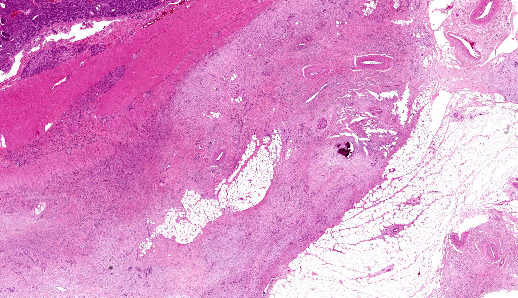This last case is a classic! Many thanks to the contributor for a great submission and write-up. Most participants were readily able to reach a diagnosis of intestinal adenocarcinoma in this case due to the high mitotic rate, degree of invasion the neoplasm into abluminal tissue layers, and the striking desmoplastic response. The deep infiltration from the mucosa outwards allows for a strong argument of a primary intestinal adenocarcinoma rather than a metastatic carcinoma. Intestinal adenocarcinomas tend to invade from the mucosa deep into and run laterally through the submucosa and subsequent layers.